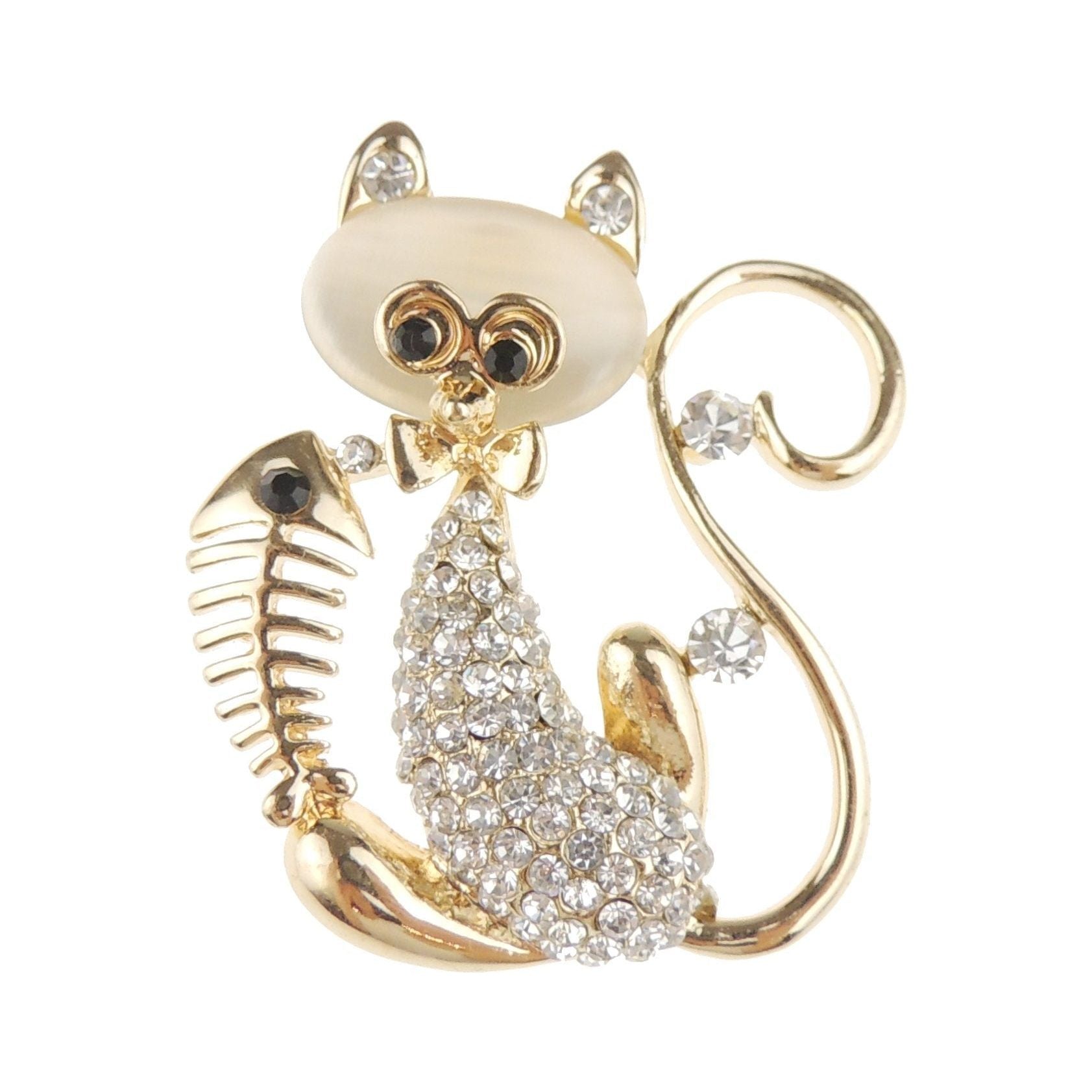 Cute Womens Wedding Christmas Birthday Gift Coat Scarf Coat Jacket Shawl Mother Groom Bride Diamante Crystal Brooch Badge Breastpin Corsage Pin Cat Kitten Kitty Fish Bones Gold Tone