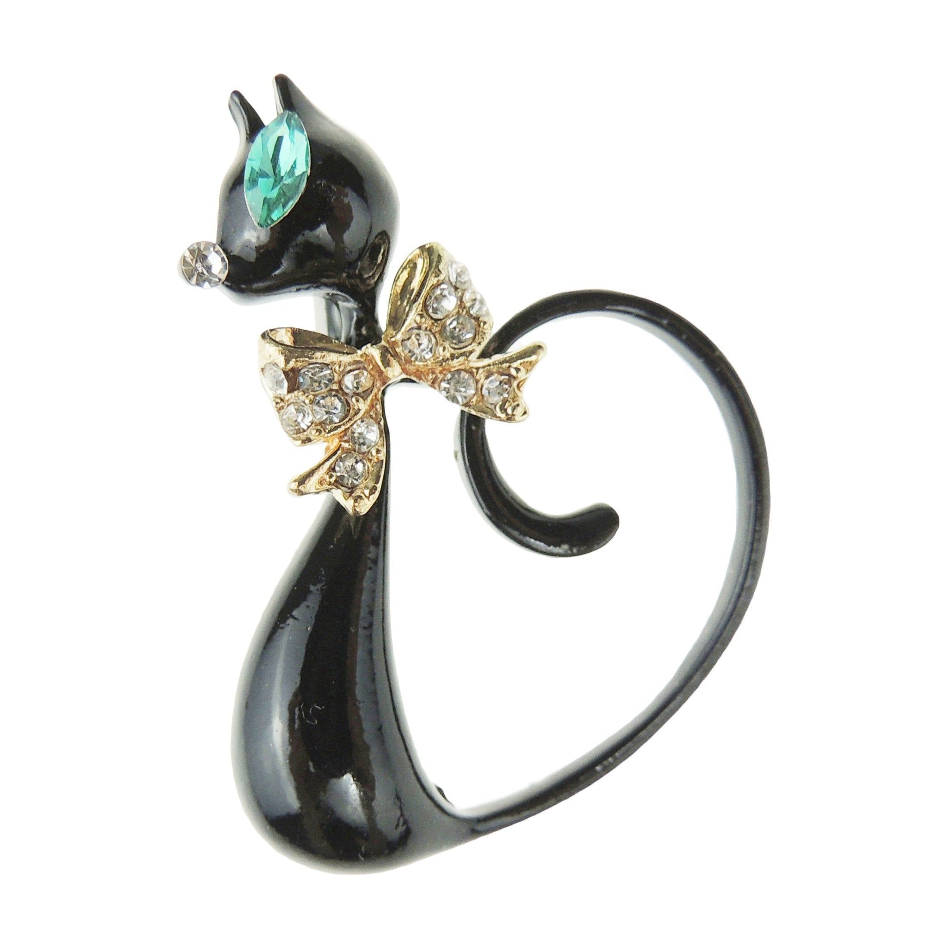 Formal Lapel Scarf Brooch Crystal Cat Tail Curled Up Enamel Green Eyes (Black)