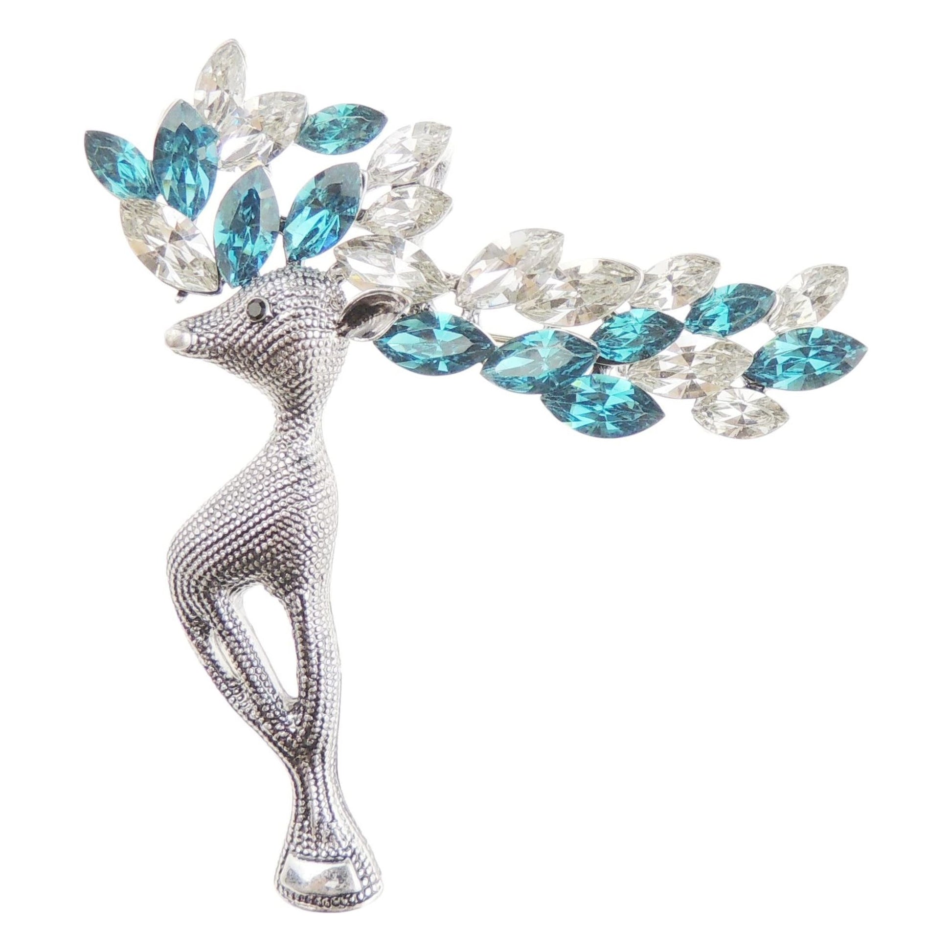 Ladies Silver Gold Tone Crystal Diamante Large Antlers Christmas Reindeer Stag Brooch Boxed (Dark Silver Tone Turquoise Clear)