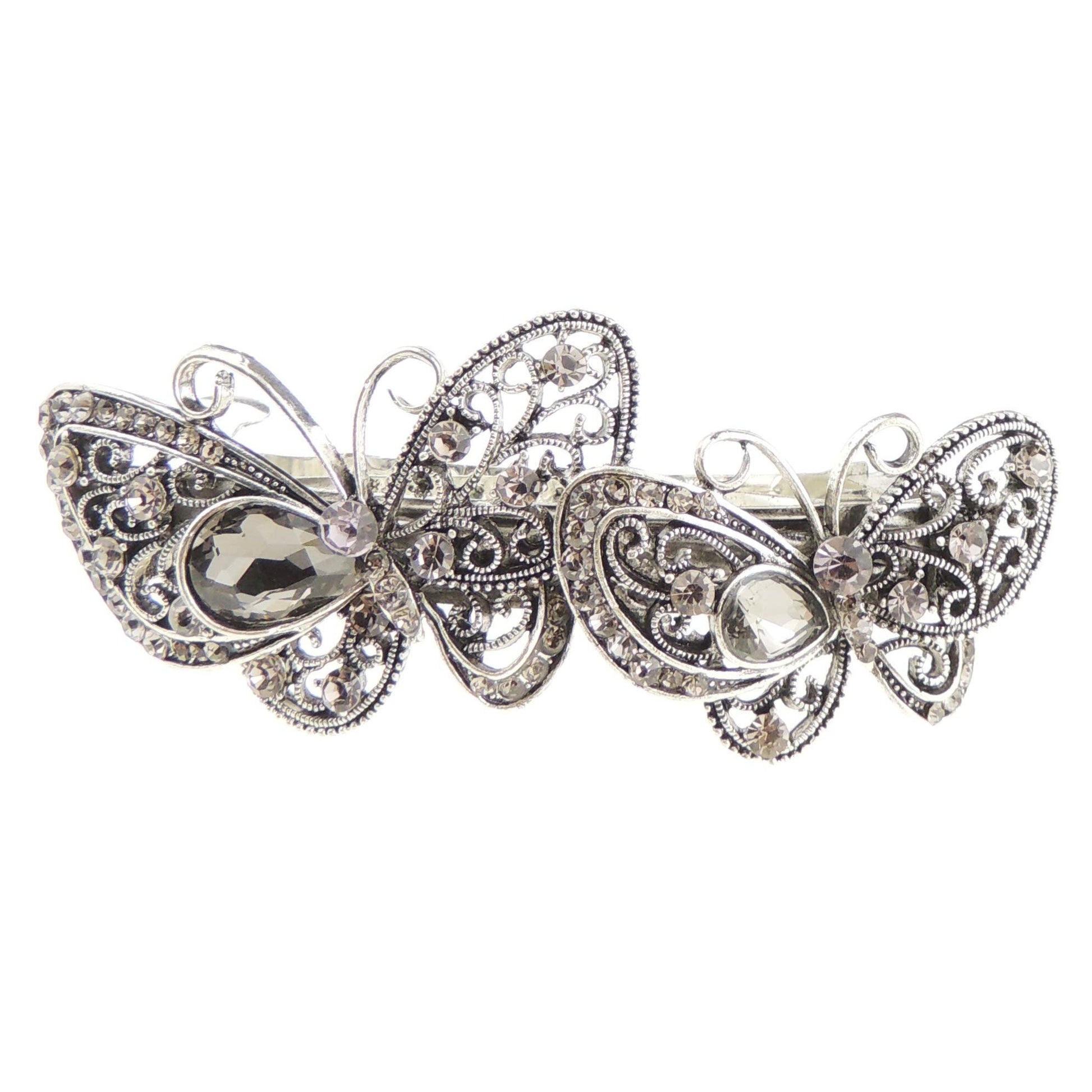 Womens Girls Vintage Look Metal Silver Tone Crystal Diamante Bridal Wedding Party Bridesmaid Birthday Hair Accessories Bulldog Styling Hair Claw Clamp Clip Stencil Barrette Butterflies