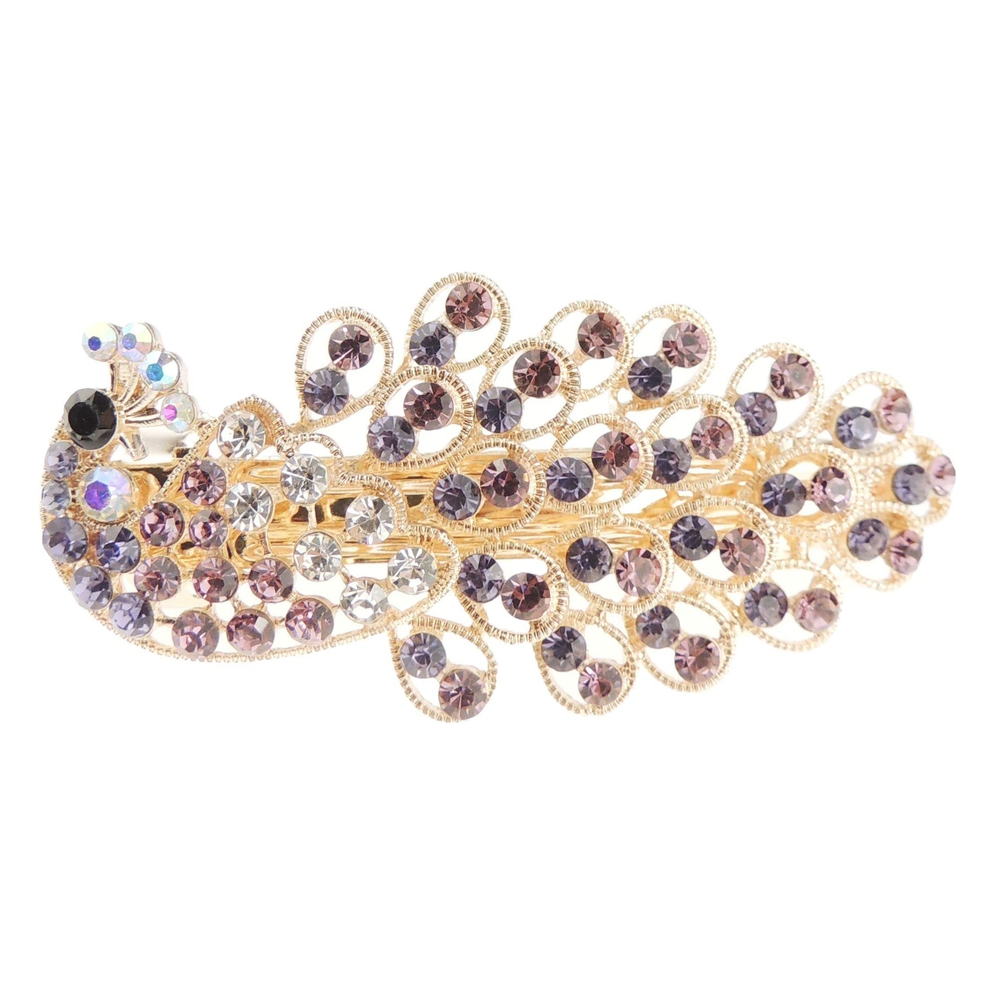 Sparkly Womens Girls Crystal Rhinestone Diamante Wedding Bridal Party Evening Ponytail Fine Hair Accessories Occasion Barrette Hairpin Grip French Metal Spring Clip Peacock Bird Gold Tone (Purple)
