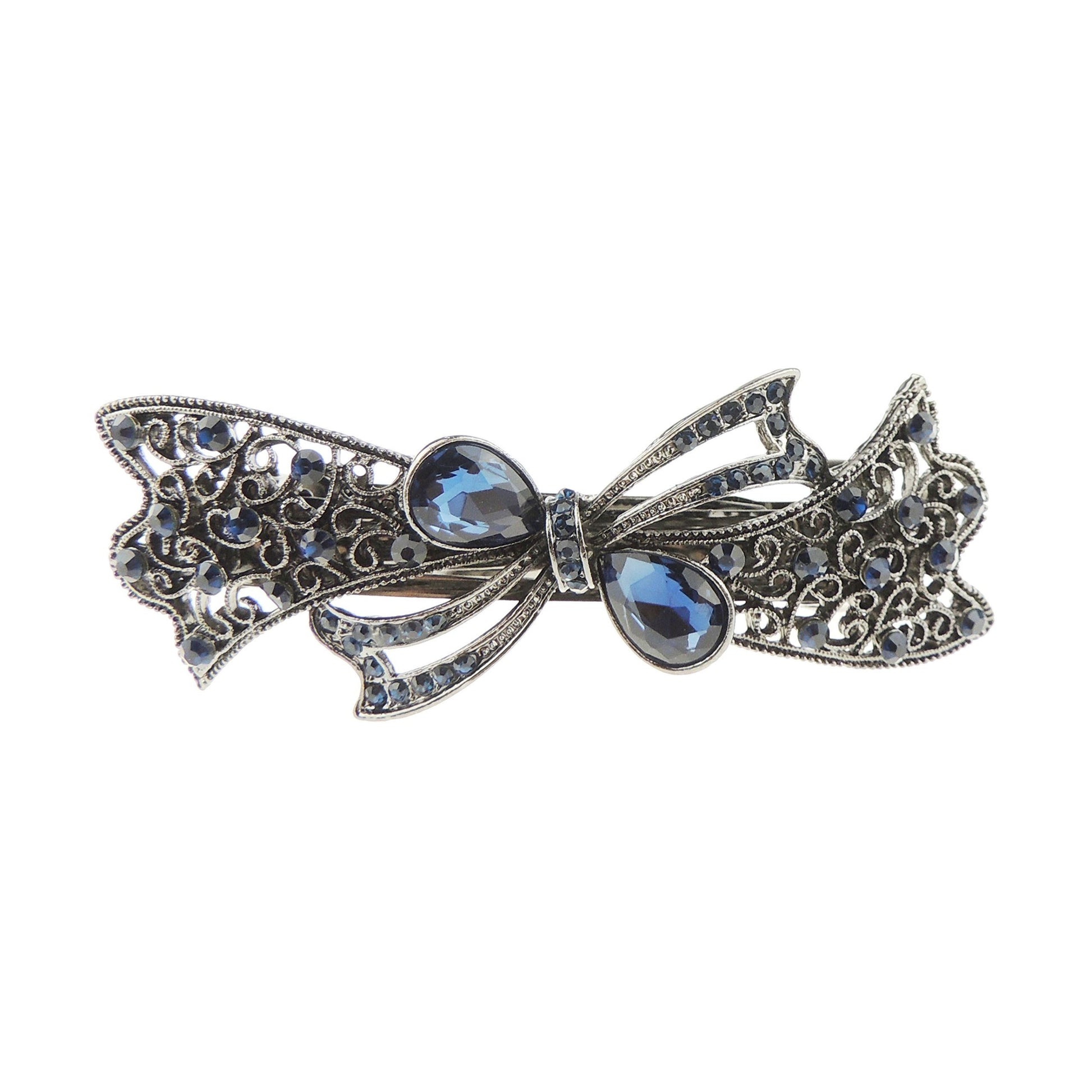 Womens Girls Vintage Look Crystal Rhinestone Diamante Wedding Birthday Party Evening Ponytail Fine Medium Hair Accessories Barrette Hairpin Silver Tone Metal French Spring Clipe Ribbon Bow (Blue)