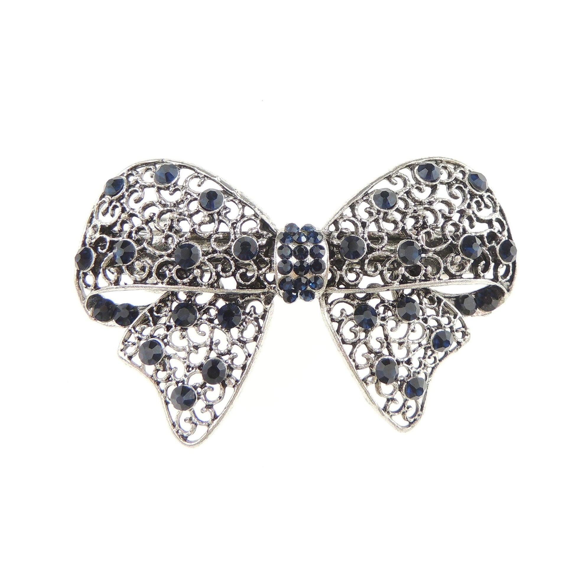 Womens Girls Vintage Look Crystal Rhinestone Diamante Wedding Birthday Party Evening Ponytail Fine Medium Hair Occasion Barrette Hairpin Silver Tone Metal French Spring Clip Ribbon Bow Dark Blue